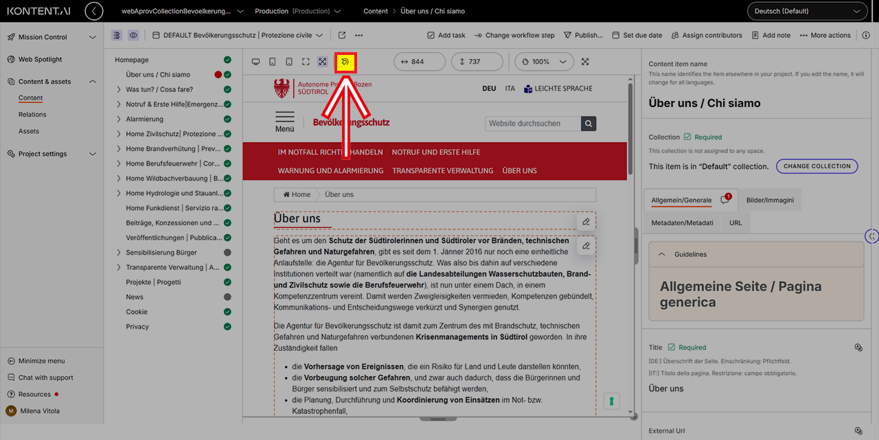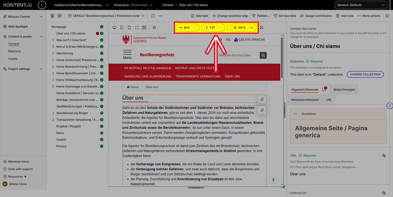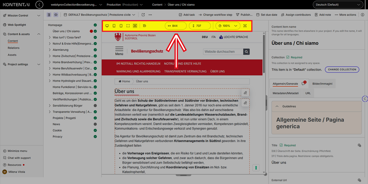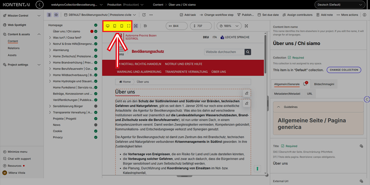 In der Live-Vorschau können Sie die Auflösung der Vorschau ändern, um zu prüfen, wie Ihre Inhalte auf verschiedenen Geräten erscheinen.