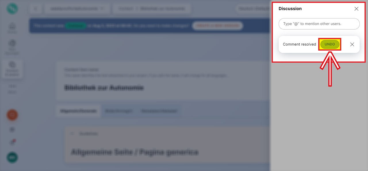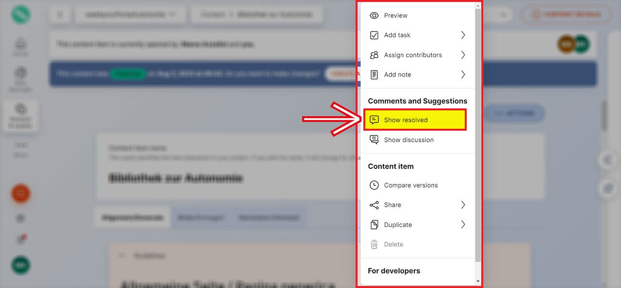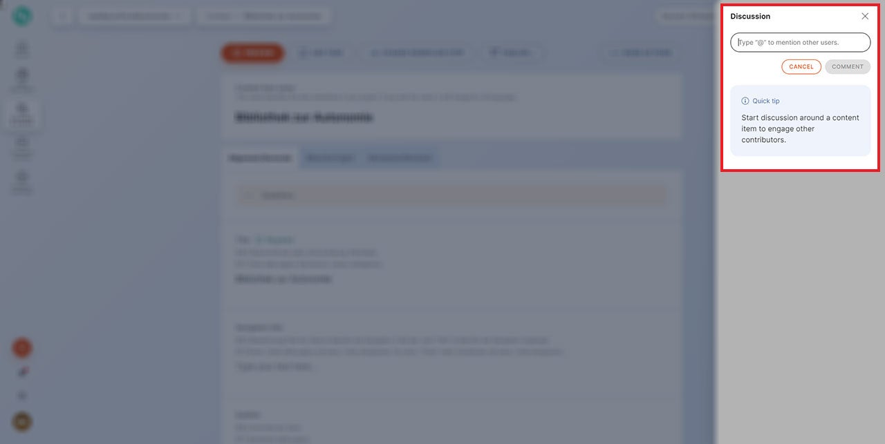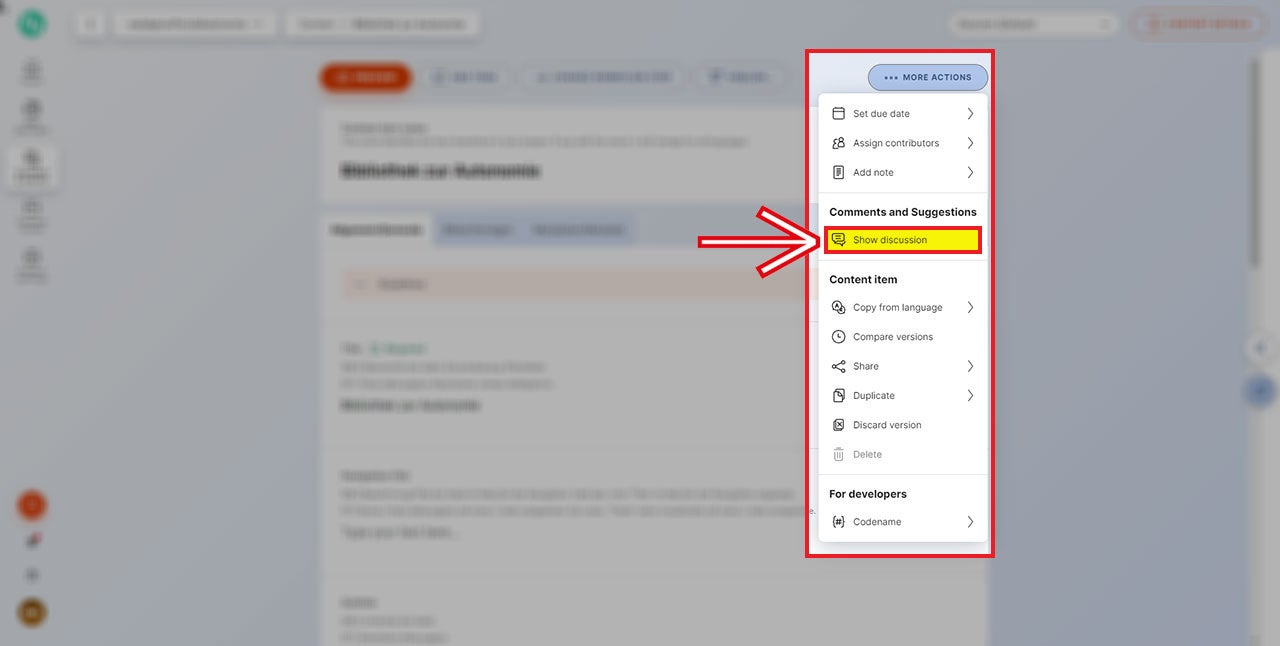Mit „Show discussion“ können wir eine Diskussion zwischen Kollegen im Arbeitsteam über die Behandlung eines bestimmten Content Items starten.