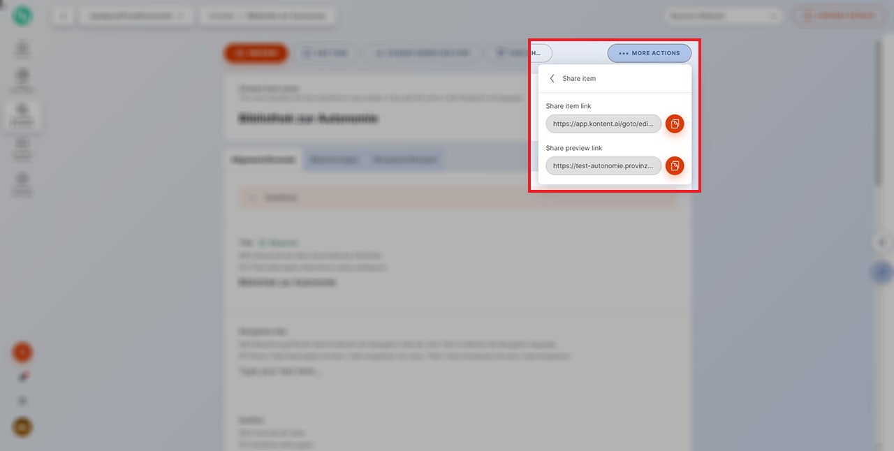 Mit dieser Funktion können Sie den Vorschau-Link kopieren (nur des geöffneten „Items“) und auch den Link zum Item selbst, falls du dieses mit jemandem teilen möchtest. Der Link führt dann direkt zum „Item“.