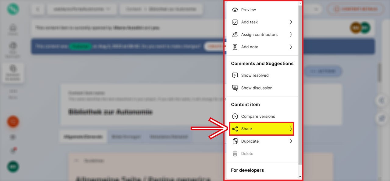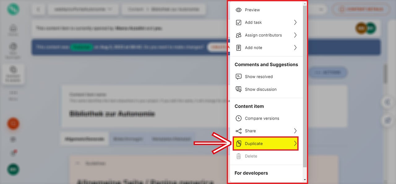 Diese Aktion kann auch unter der rechten Kolonne „Content details“ ausgeführt werden.