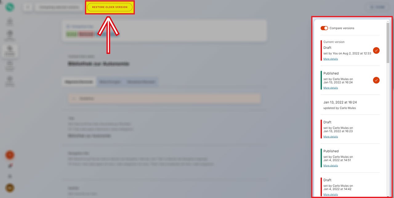 In der rechten Kolonne werden alle einzelnen Versionen mit dazugehörigem „Workflow“-Step, Abänderungsdatum, Änderungsautor, etc. aufgelistet. Die erwünschte Version muss angeklickt werden und mit dem Button „Restore older version“ wird letztendlich die Auswahl bestätigt.