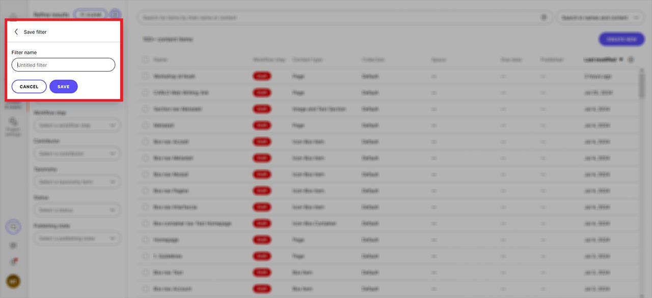 Um einen Filter zu speichern, musst du ihm einen Namen geben. Wähl ihn so, dass du den Filter später von anderen unterschieden kannst. Anschließend kannst du den Filter mit dem Button „Save“ speichern. Gespeicherte Filter funktionieren für alle Sprachvarianten.