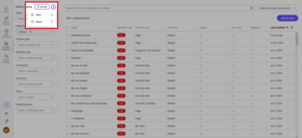 Du kannst einen Filter auch mit anderen Personen im Projekt teilen, indem du auf den Button „Share“ klickst und den Link kopierst. Der Link führt direkt in das „Content“ Menü mit dem entsprechenden Filter.