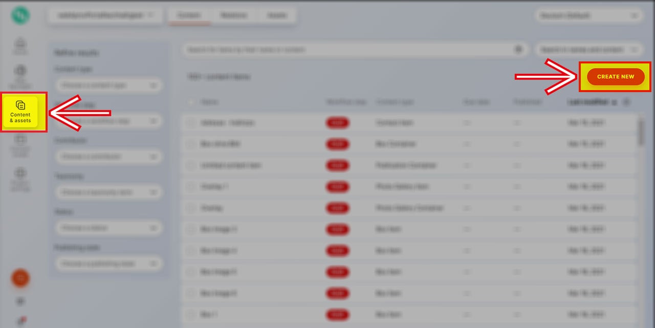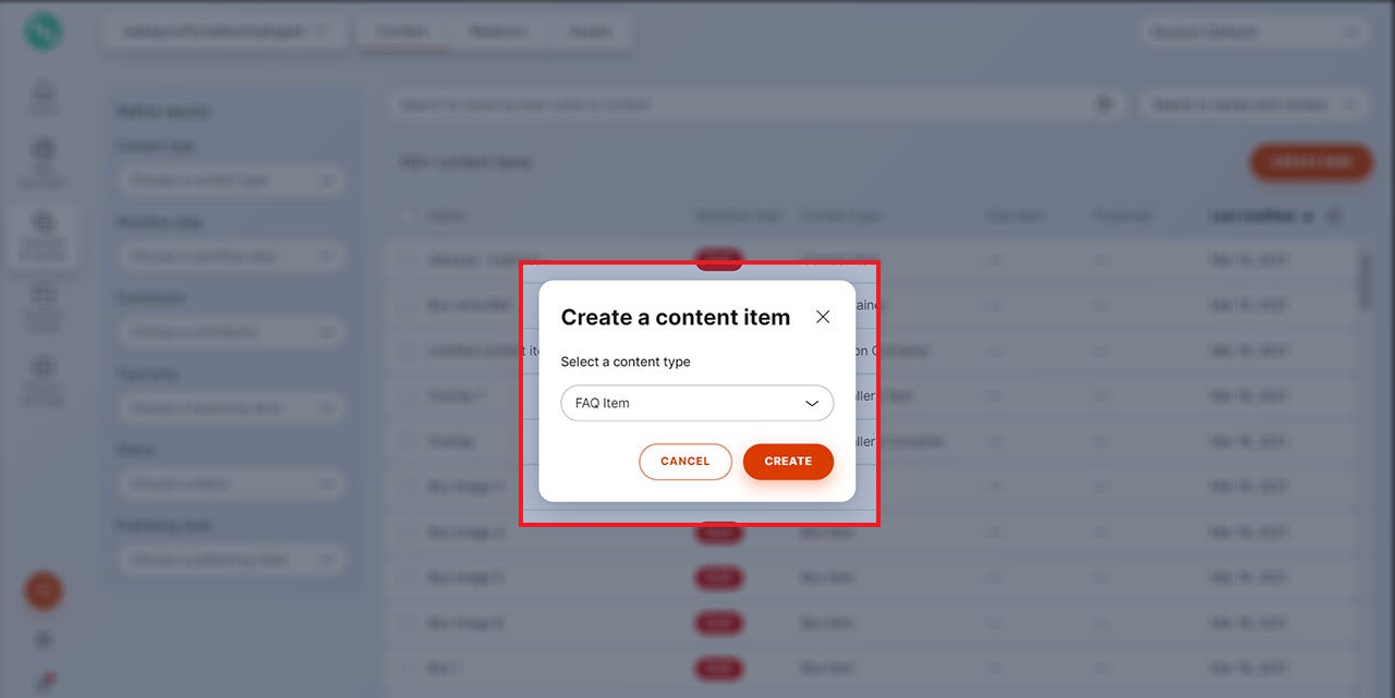 Du kannst für beide Verwendungszwecke das Typ „FAQ Item“ direkt über die Schaltfläche „Create new“ im Abschnitt „Content & assets“ erstellen.