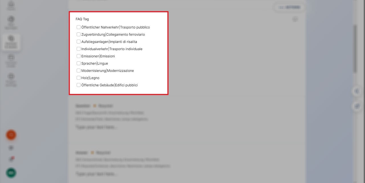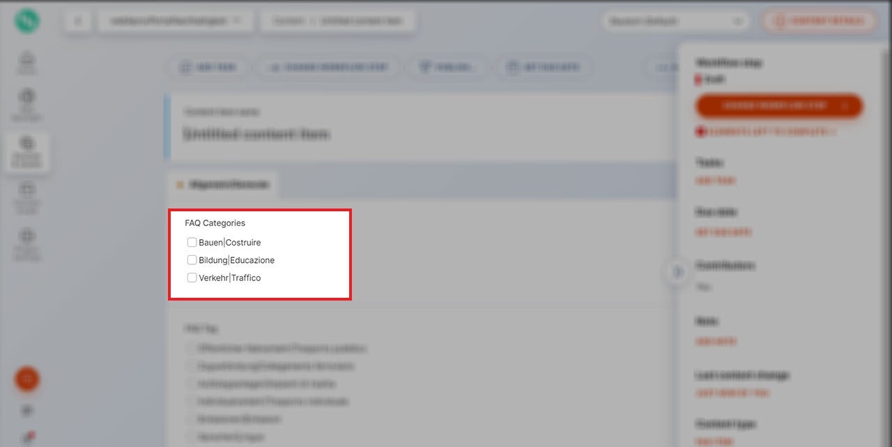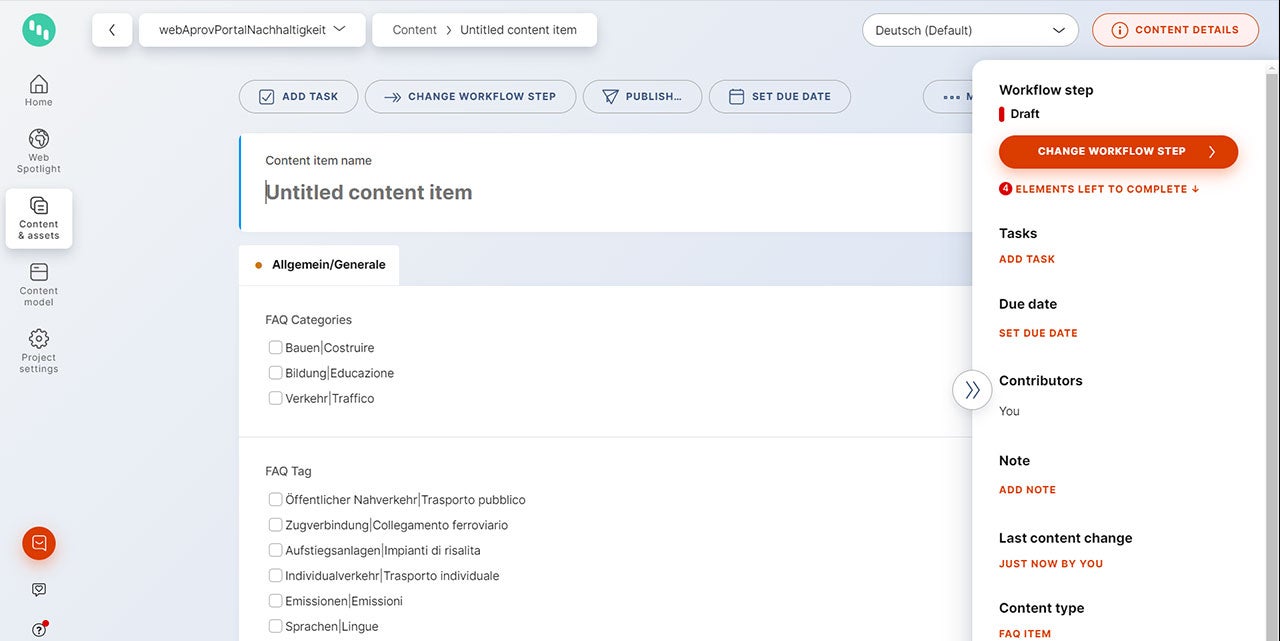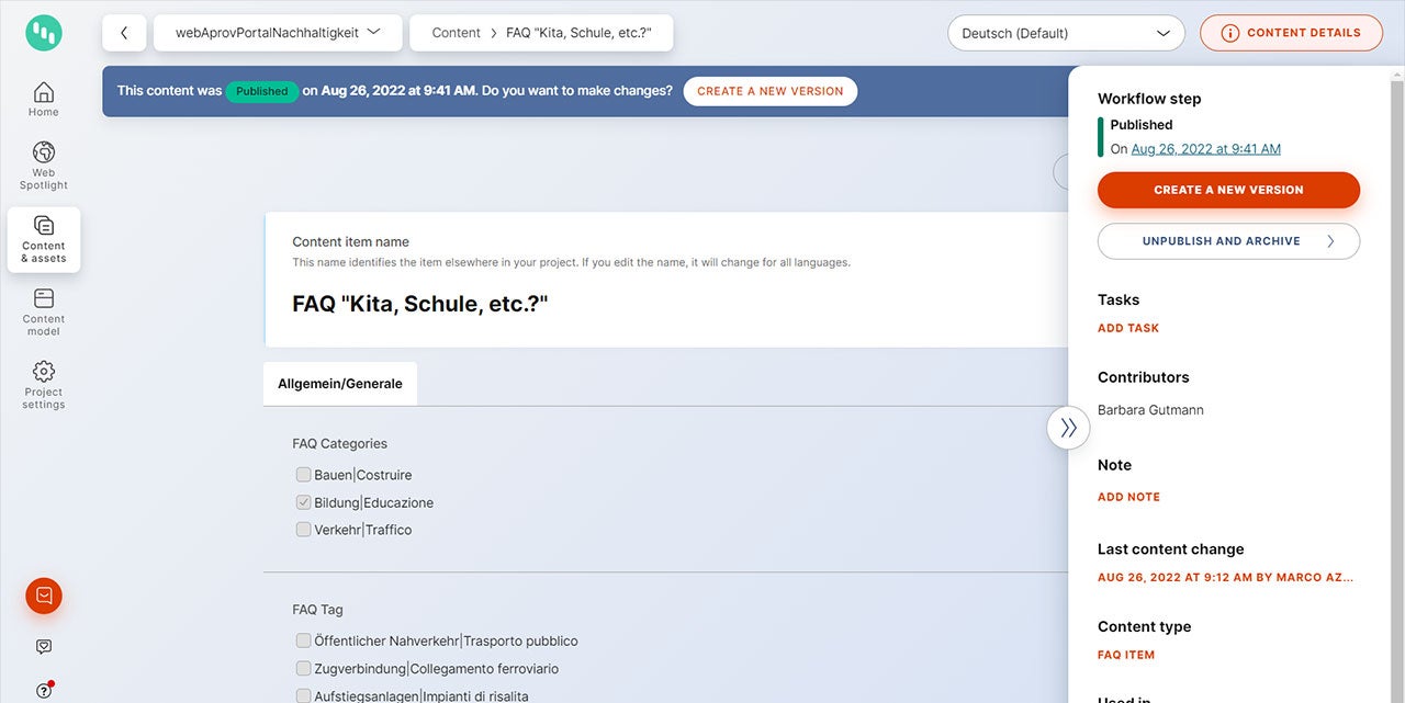 Der Name des Items wird nur als Arbeitstitel in Kontent.ai verwendet und ist also nicht der Titel, den du online siehst – es kann aber natürlich eine Übereinstimmung geben. Der Name des Items dient zur Identifizierung des Elements im CMS und dient für die Suche unter dem Feld im Abschnitt „Content & Assets“. Als Standard soll ein Name für alle Sprachvarianten des Projekts vergeben werden, z. B. Name Titel FAQ / Nome titolo FAQ. Trenne am besten die Sprachversionen mit einem „Slash“ (/) oder „Pipe“ (|).