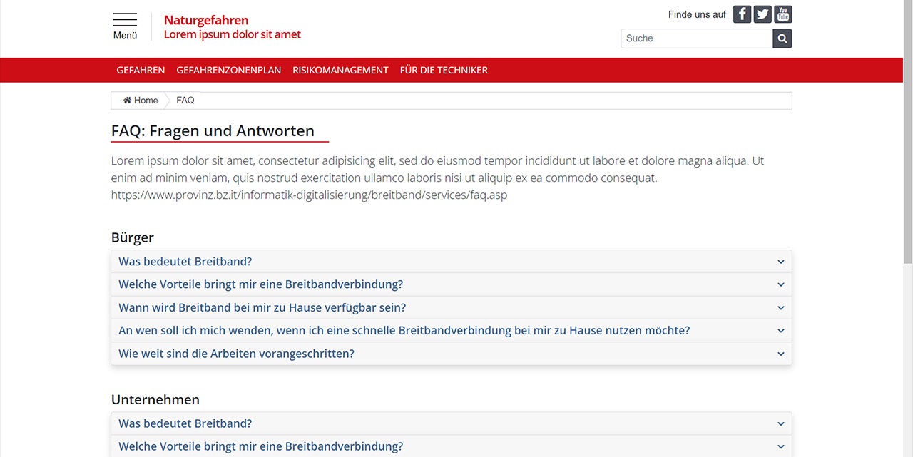 - „FAQ simply“: einerseits ermöglicht es die Darstellung der häufigsten Fragen und Antworten als Collapse, nach Kategorien getrennt und einer oder mehreren Detailseiten eingebaut.