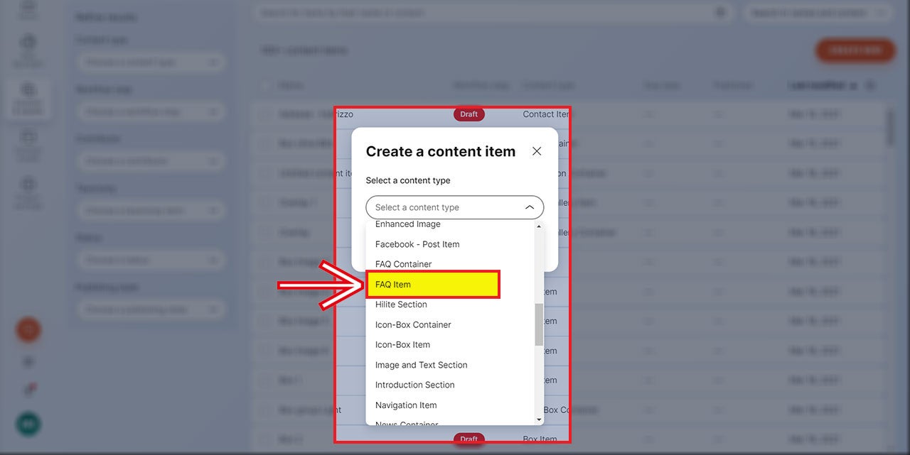 Nun musst du den gewünschten Inhaltstyp auswählen, in diesem Fall „FAQ Item“.