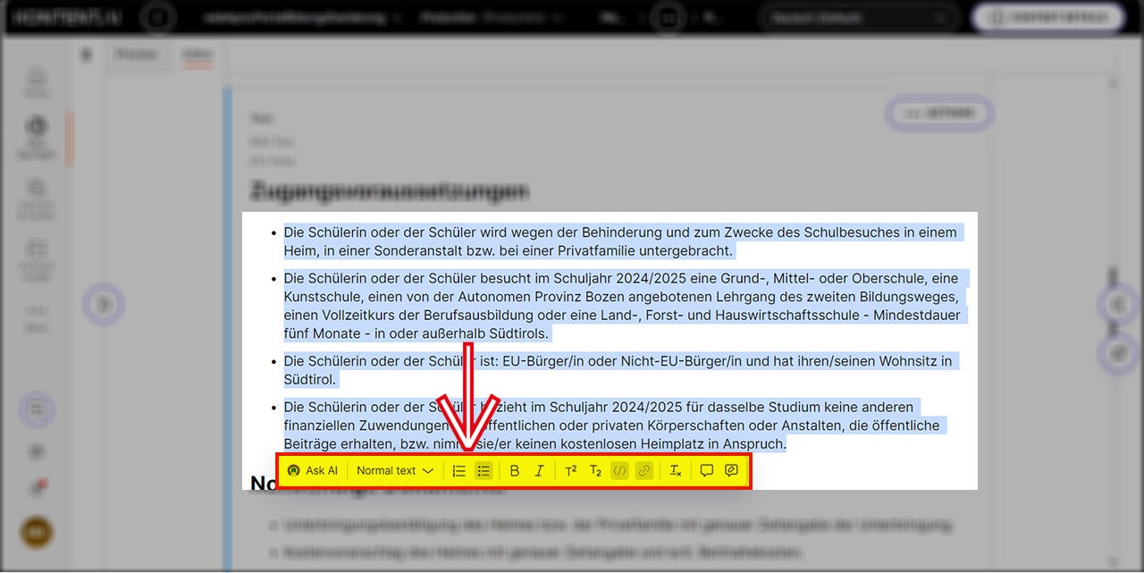 Um eine Aufzählung oder eine nummerierte Liste zu erstellen, gibt es die Auswahl im Editor (im Textfeld) des CMS. Zunächst muss der Text eingegeben werden, dann wird der gesamte Teil, der in eine Liste umgewandelt werden soll, ausgewählt und die Art der Liste durch Anklicken des entsprechenden Symbols festgelegt.