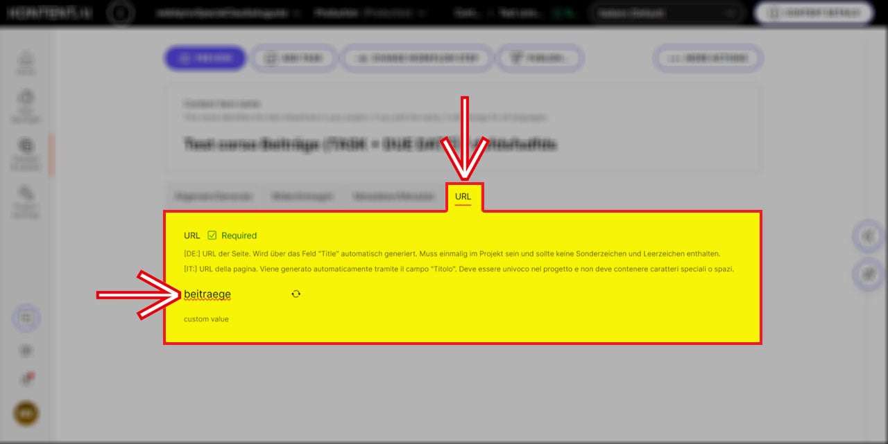 Denken Sie daran, dass „Umlaute“ vom CMS nicht aufgelöst werden, so dass Sie die Wörter im Abschnitt „URL“ manuell korrigieren müssen. Fügen Sie hierzu einfach ein „e“ ein (ue, ae, oe).
