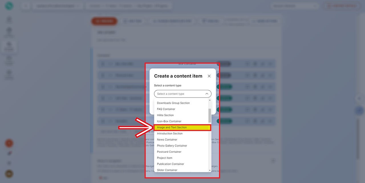Anschließend erfolgt die Auswahl des erwünschten „Content types“, in diesem Fall „Image and Text Section“.