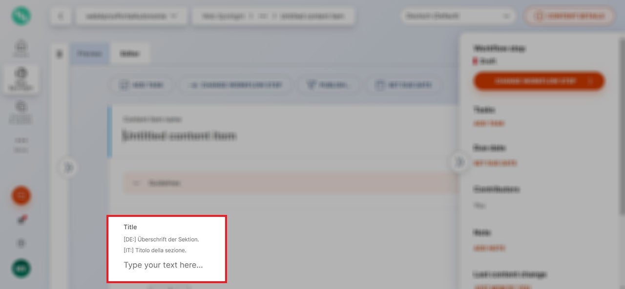 Dieser Name ist nur ein programminterner Name im CMS Kontent.ai, somit nicht der Titel des Moduls, der online auf der Seite erscheint, dennoch kann aber eine Entsprechung stattfinden. Dieser Name identifiziert das „Item“ im CMS und wird für die Volltextsuche im Bereich „Content & assets“ verwendet. Standardmäßig wird für alle Sprachversionen ein Name vergeben, z. B. Name Modul / Nome Modulo.