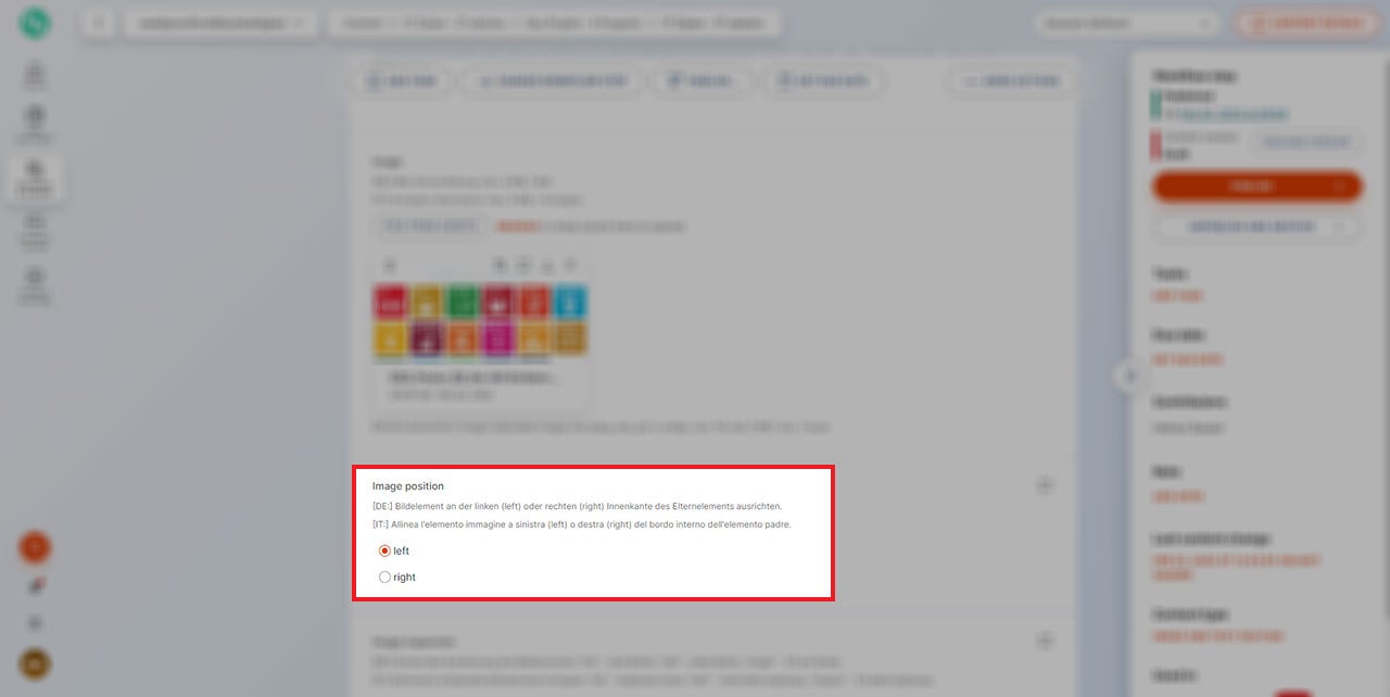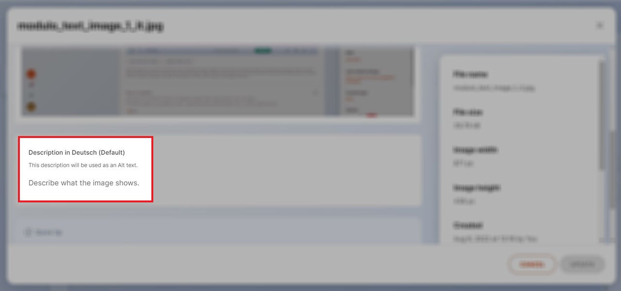 Sobald ein Bild eingefügt wird, muss sogleich der Beschreibungstext ("alt-text") im vorgesehenen Feld eingetragen werden. Falls das Bild vom Bildarchiv des Projekts („Assets“-Bereich) des Projekts hochgeladen wird, muss dieses Feld kontrolliert und eventuell ausgefüllt werden.