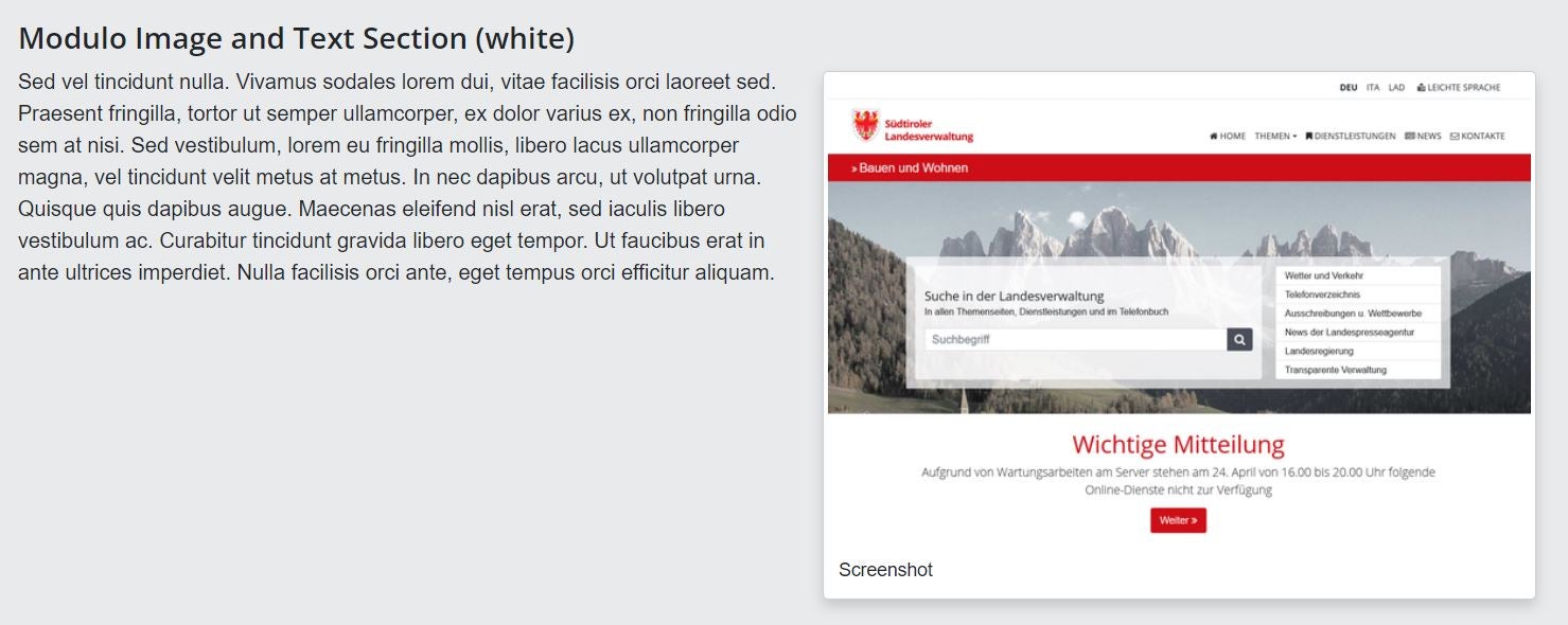 Online: Beispiel Vorschau des Moduls „Image and Text Section“, Bild mit Text (hellgraue Variante + Bild „half“):