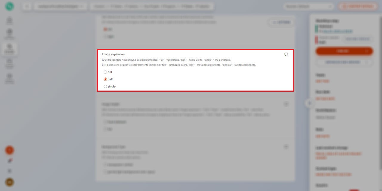 Außerdem ist es möglich, die Ausdehnung des Bildes in der zur Verfügung stehenden Breite zu definieren. Ein Bild kann die gesamte zur Verfügung stehende Breite des Inhaltes einnehmen („full“), nur eine Hälfte davon („half“) oder letztendlich nur ein Drittel („single“).