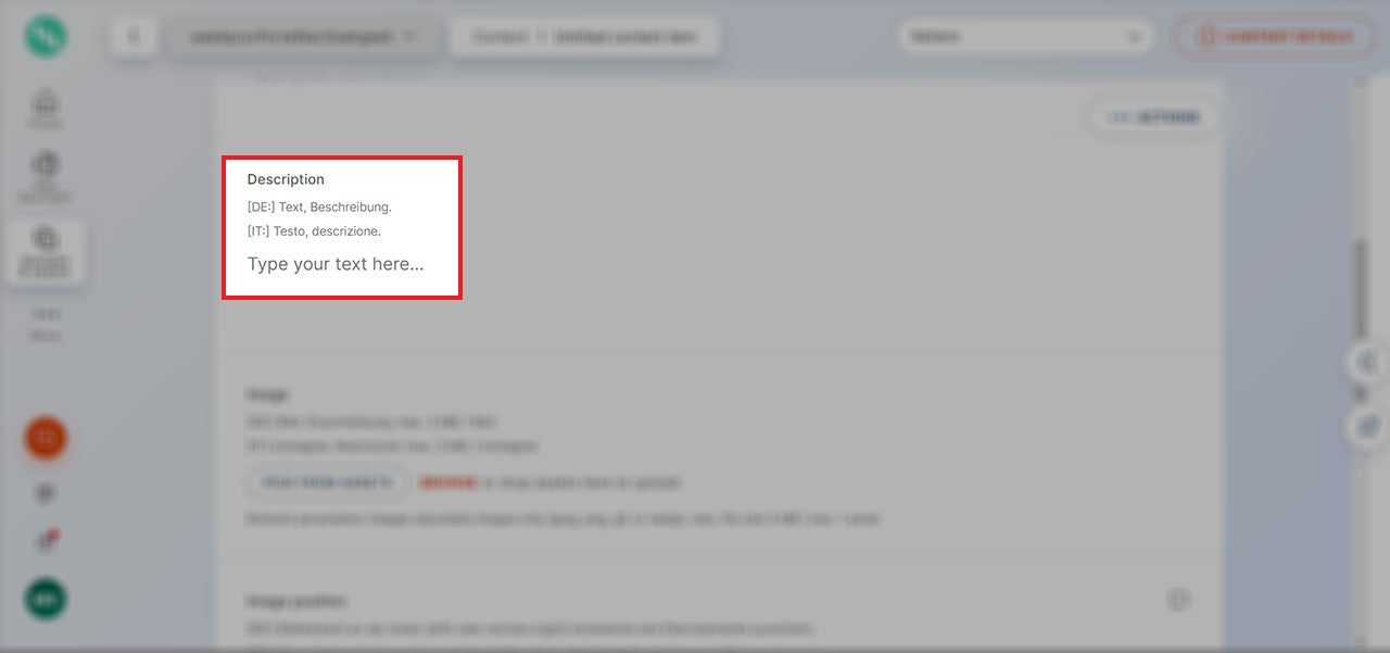 In diesem Feld wird der Beschreibungstext eingefügt. Hier sind keine Bilder vorgesehen, sondern nur im gewidmeten Bereich „Bilder/Images“.
