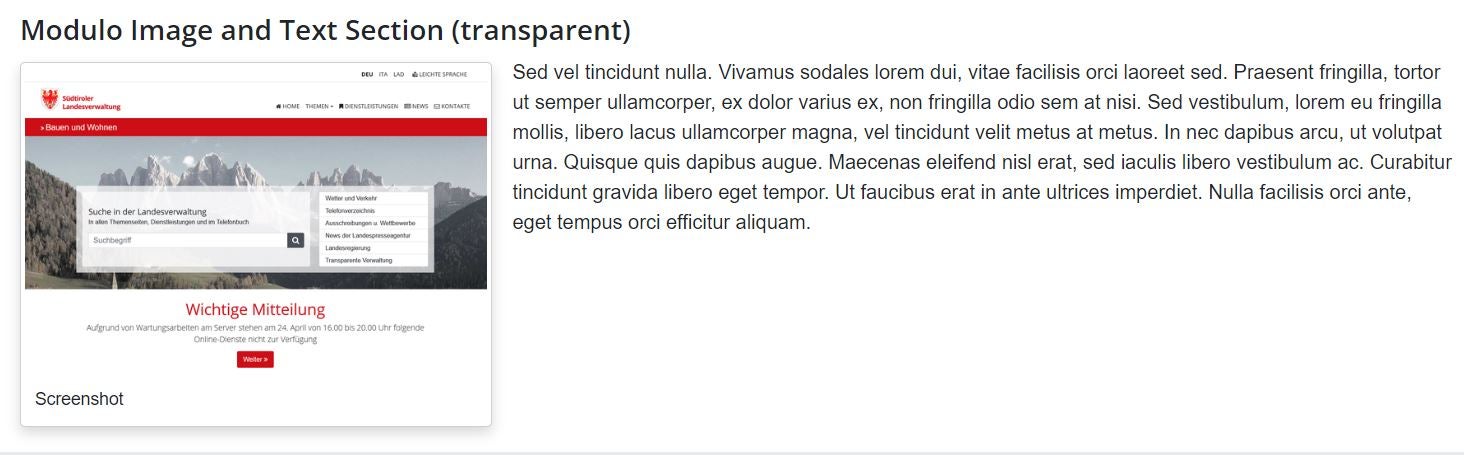 Online: Vorschau zu einem Beispiel des Moduls „Image and Text Section“, Bild mit Text (transparente Variante + Bild „single“):
