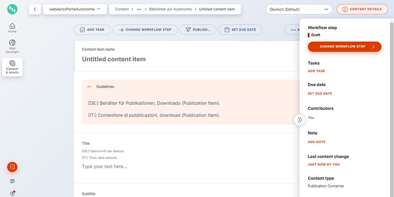 Wenn du auf die Schaltfläche „Create new item“ klickst, öffnet sich ein neues Fenster mit dem Inhaltstyp „Publication Item“. Bestätige diesen Schritt mit dem Button „Create“. Anschließend öffnet sich direkt das neue Modul, wo du die erforderlichen Felder ausfüllen musst.