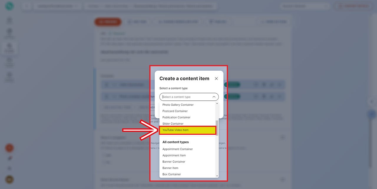 Nun wird das erwünschte Modul aus der Liste der „Content types“ ausgewählt, in diesem Falle „YouTube Video Item“.
