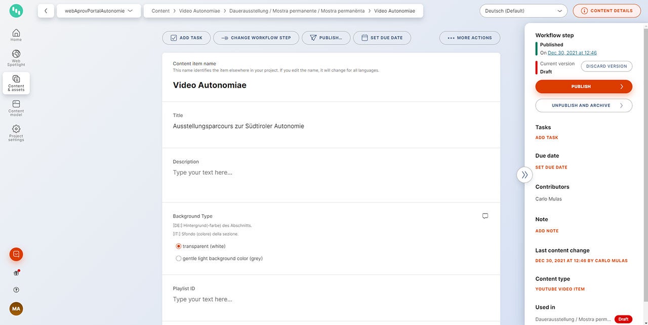 Das Feld „Content item name“ ist nur ein programminterner Name und erscheint nur im CMS Kontent.ai selbst, d. h. dieser Name ist online nicht sichtbar und entspricht nicht dem Titel im Text. In gewissen Fällen aber, kann es diese Entsprechung geben. Dieser Name erlaubt es, das Item im CMS zu identifizieren und wird u. a. auch für die Volltextsuche unter „Content & assets“ benutzt.